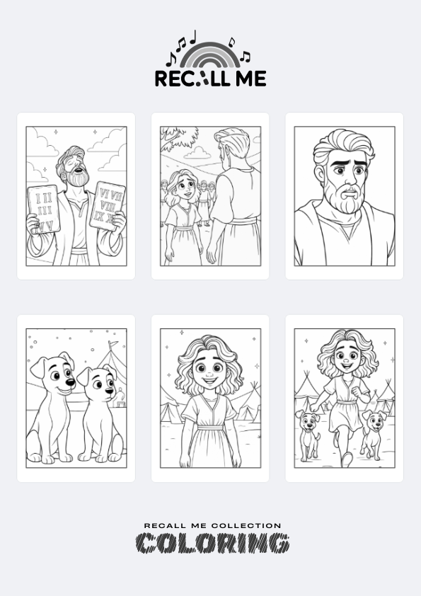 Digital PDF file, with 18 coloring pages from the song 10 Little Rules, based on the Ten Commandments.